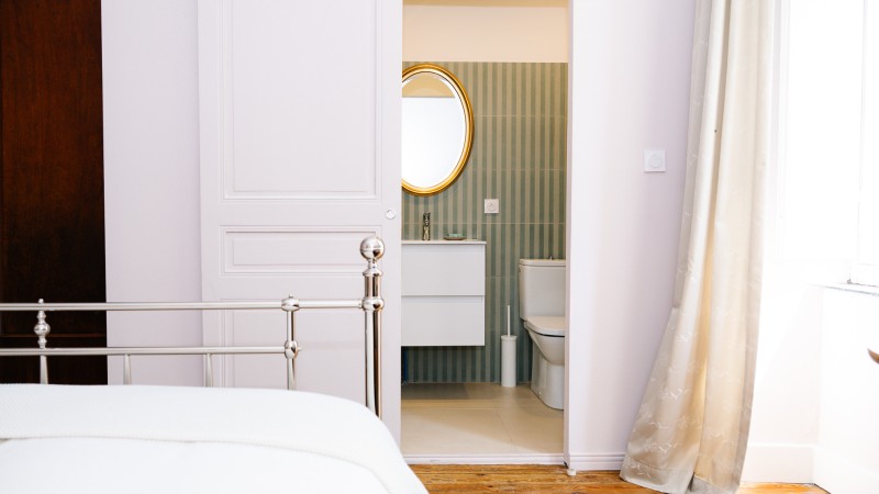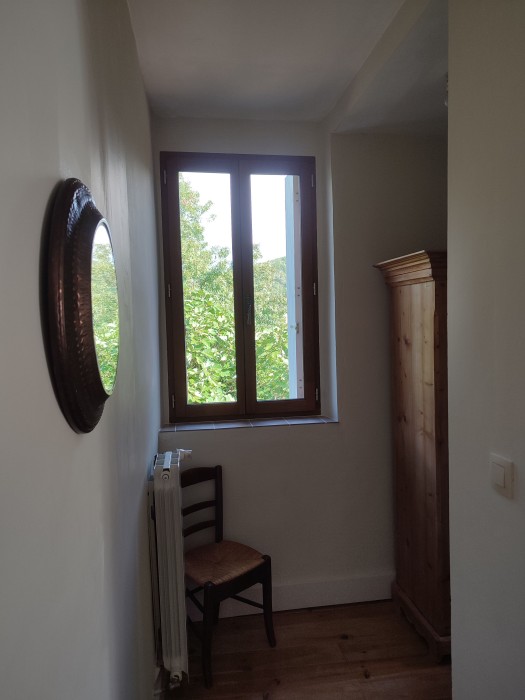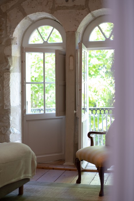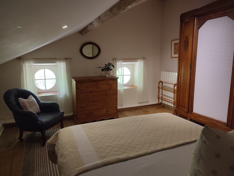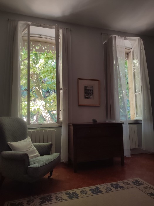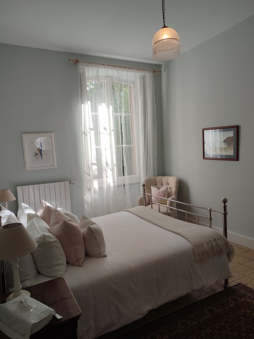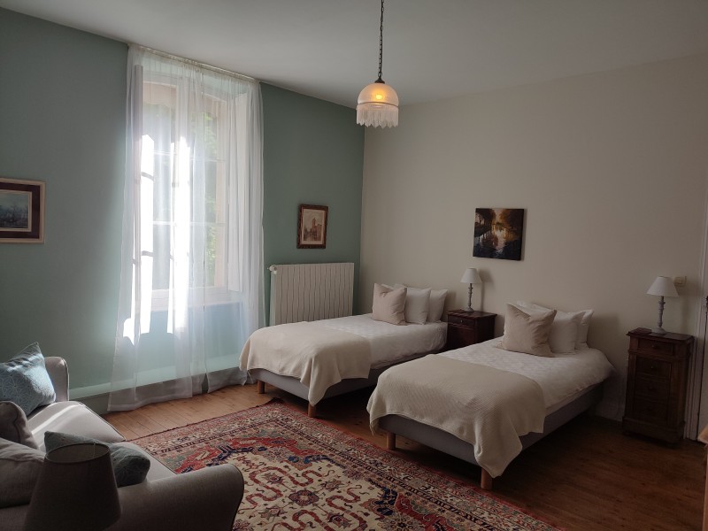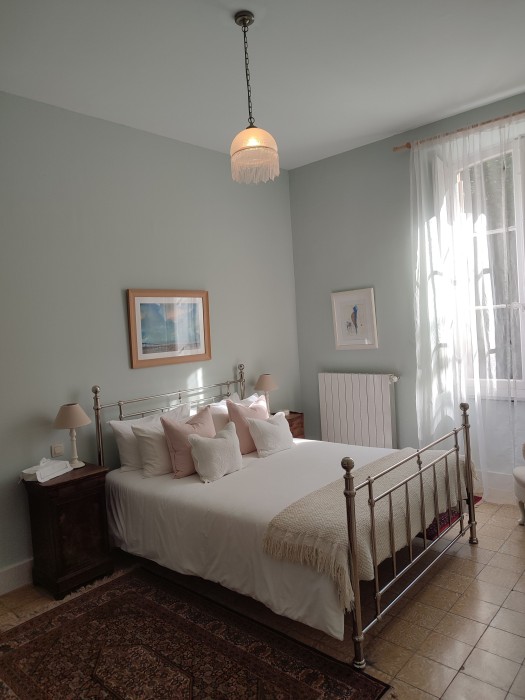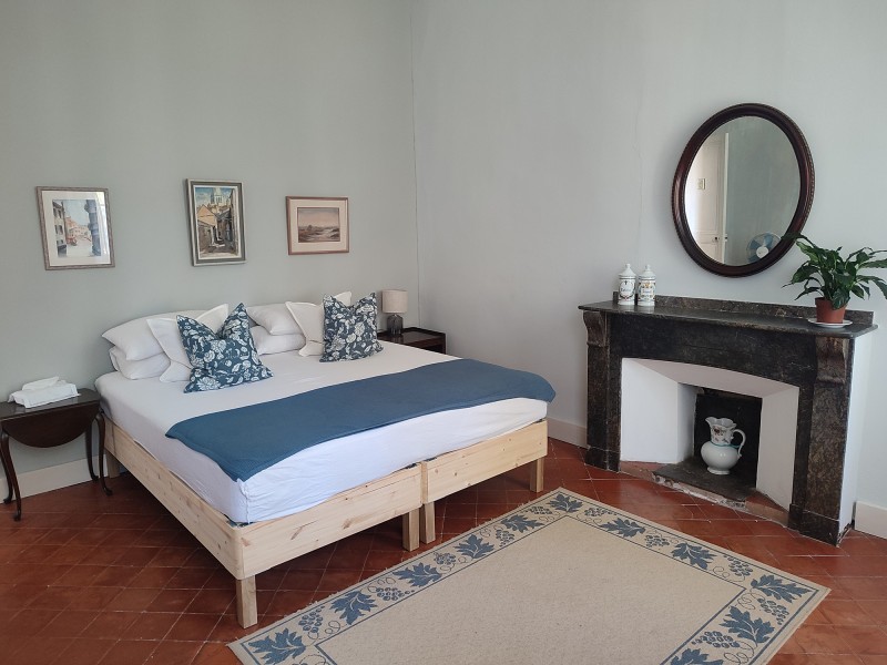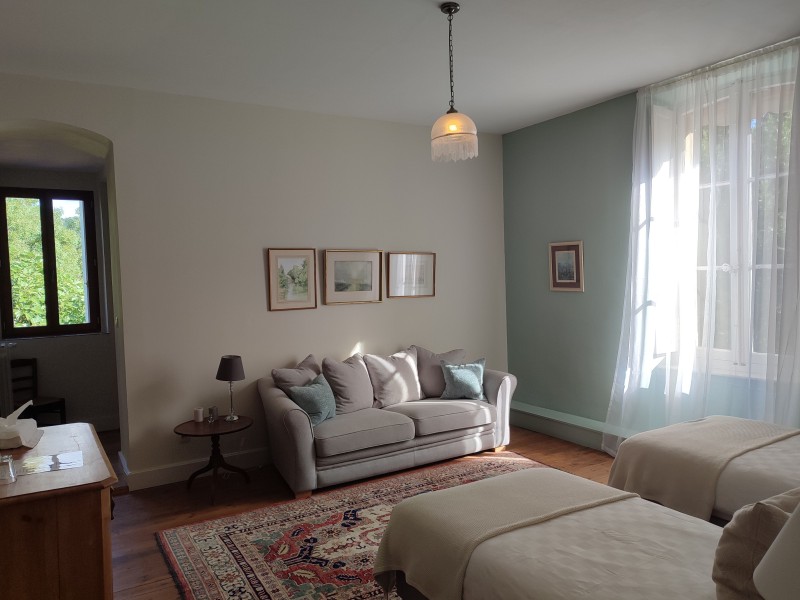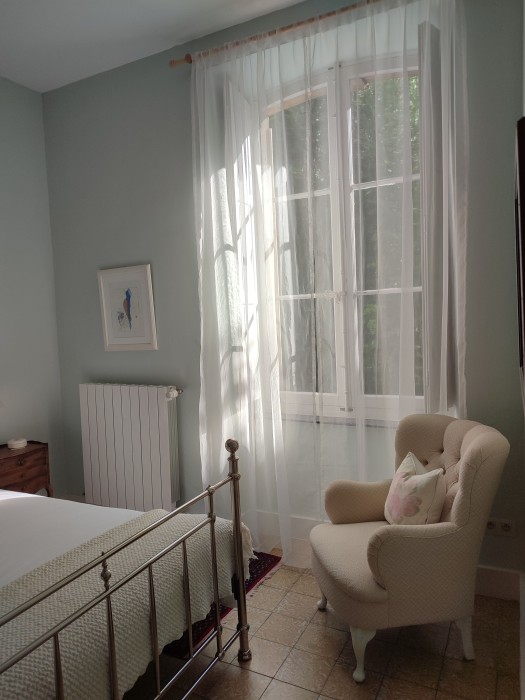 A large and charming twin bedded room on the second floor with views of the hills over which the sun rises in the morning. It boasts a little sitting area and writer’s desk should you feel the desire to send a postcard home about the magical time you are having at Les Marguerites. Room 6 shares a family bathroom with Room 7.